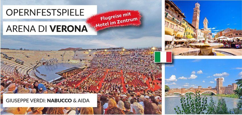 Verona - die Stadt Romeo und Julias! Ein romantischer Ort voller Leben und Geschäftigkeit, von seltener Schönheit und Heimat der einzigartigen ARENA, in der Sie zwei große Opern von Giuseppe Verdi erleben können!