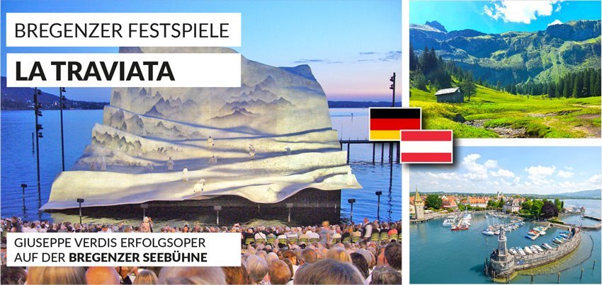 Die Festspiele Bregenz inszenieren 2026 Verdis Erfolgsoper LA TRAVIATA - und bieten so eine der erfolgreichsten Opern der Musikgeschichte auf der spektakulären Seebühne im Bodensee! Der große Opernklassiker über eine Liebe gegen die Zeit und alle Konventionen eroberte um 1860 in kürzester Zeit die Bühnen der Welt. Unser bewährtes Reisekonzept bietet Ihnen den Besuch dieses Opernereignisses ebenso, wie das geruhsame Erleben des Bodensees und der Landschaften Vorarlbergs an..